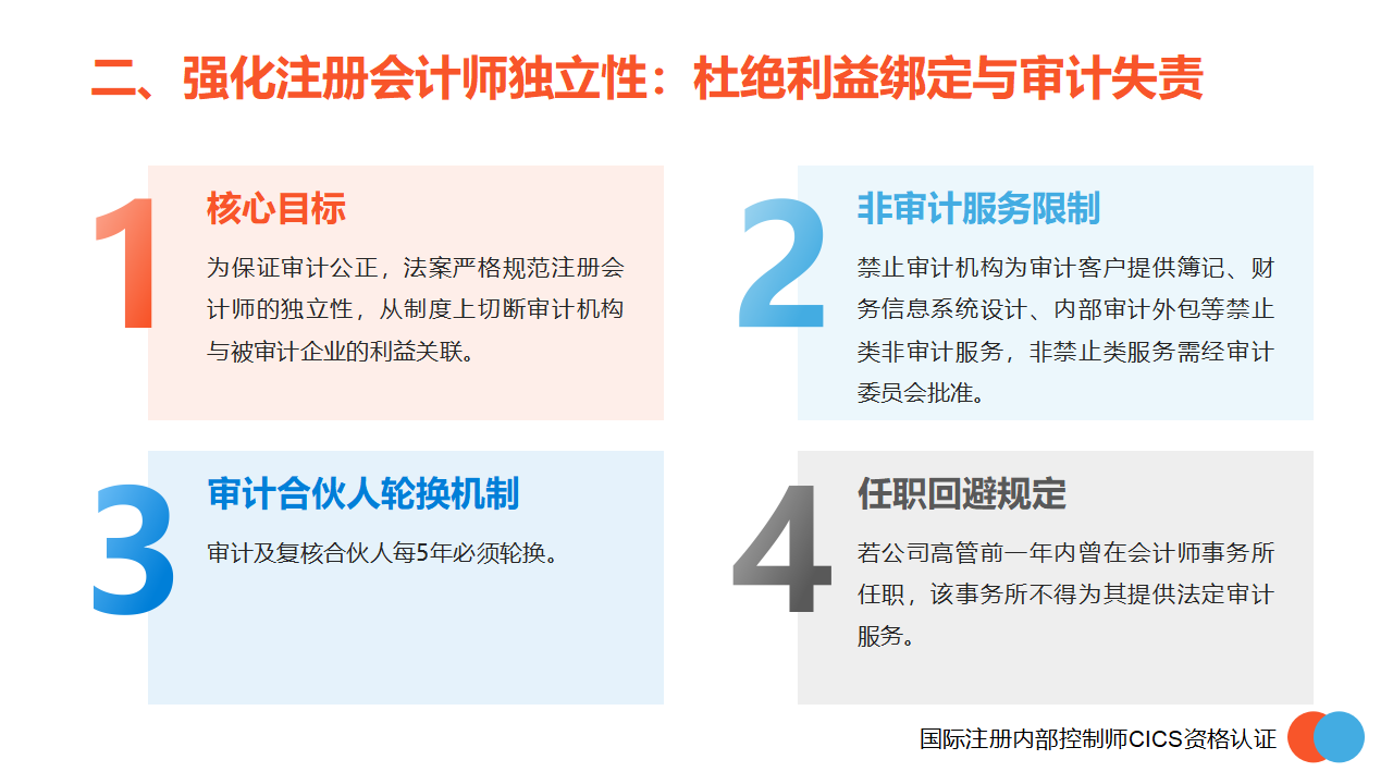 为保证审计公正,法案严格规范注册会计师的独立性:禁止审计机构为审计客户提供簿记、财务信息系统设计、内部审计外包等禁止类非审计服务,非禁止类服务需经审计委员会批准;审计及复核合伙人每5年必须轮换;若公司高管前一年内曾在会计师事务所任职,该事务所不得为其提供法定审计服务,从制度上切断审计机构与被审计企业的利益关联。