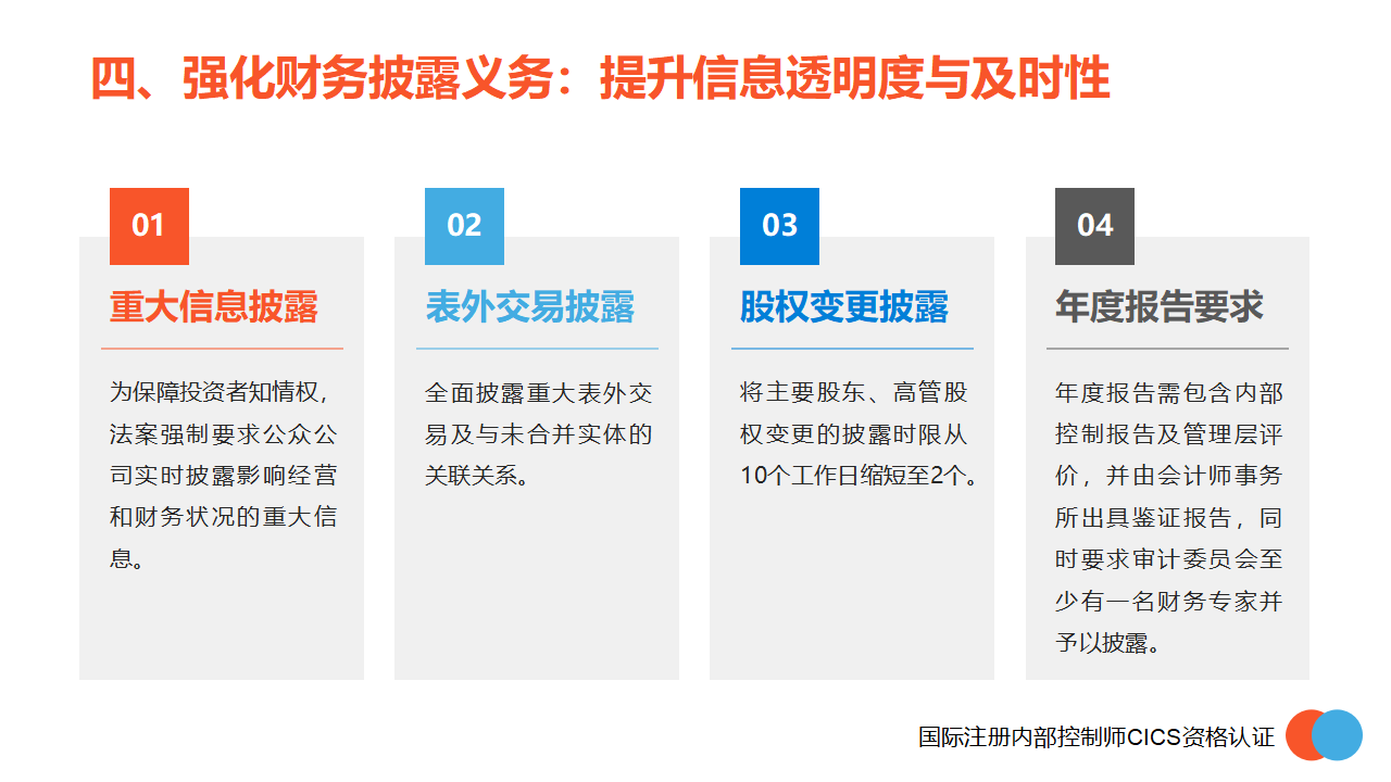 为保障投资者知情权,法案强制要求公众公司实时披露影响经营和财务状况的重大信息;全面披露重大表外交易及与未合并实体的关联关系;将主要股东、高管股权变更的披露时限从10个工作日缩短至2个;年度报告需包含内部控制报告及管理层评价,并由会计师事务所出具鉴证报告,同时要求审计委员会至少有一名财务专家并予以披露。