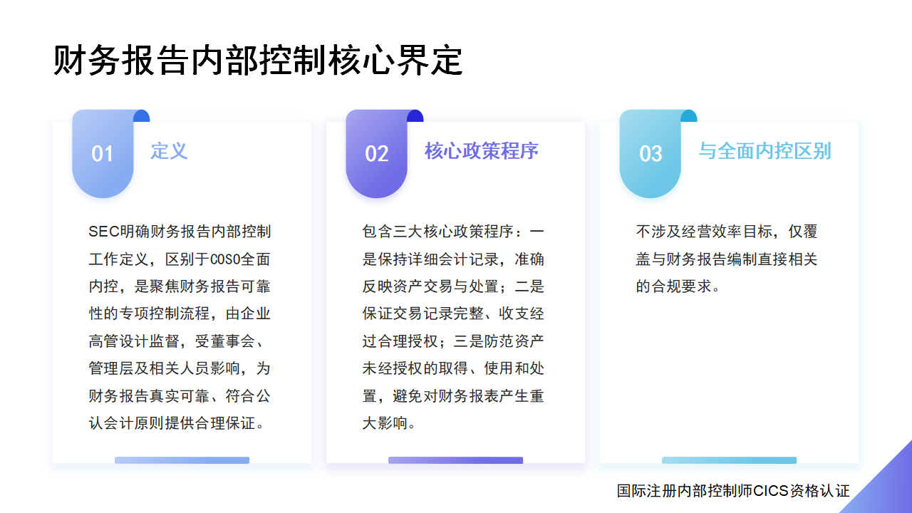 SEC对财务报告内部控制有明确的工作定义,它区别于COSO框架的全面内控,是聚焦财务报告可靠性的专项控制流程。其核心是由企业高管设计并监督,受董事会、管理层及相关人员影响,为财务报告真实可靠、符合公认会计原则提供合理保证。具体包含三大核心政策程序:一是保持详细会计记录,准确反映资产交易与处置;二是保证交易记录完整、收支经过合理授权;三是防范资产未经授权的取得、使用和处置,避免对财务报表产生重大影响。与全面内控相比,它不涉及经营效率目标,仅覆盖与财务报告编制直接相关的合规要求。
