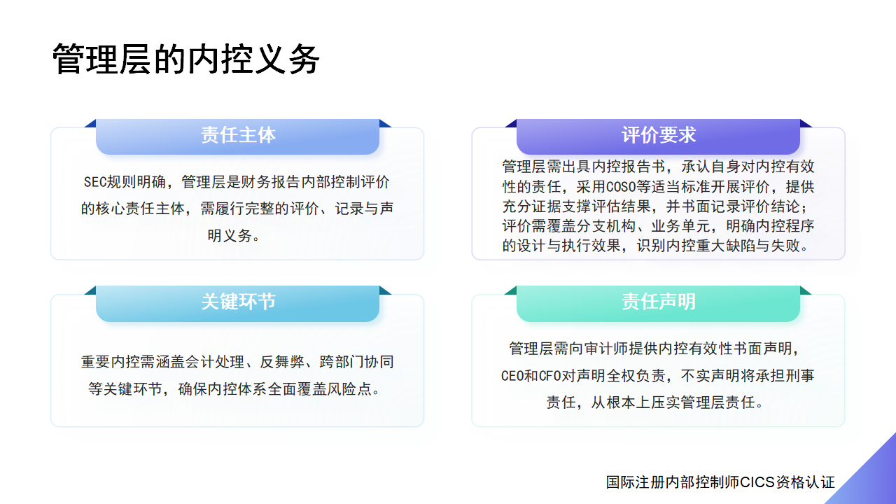 SEC规则明确,管理层是财务报告内部控制评价的核心责任主体,需履行完整的评价、记录与声明义务。首先,管理层需出具内控报告书,承认自身对内控有效性的责任,采用COSO等适当标准开展评价,提供充分证据支撑评估结果,并书面记录评价结论;其次,评价需覆盖分支机构、业务单元,明确重要内控程序的设计与执行效果,识别内控重大缺陷与失败;再次,重要内控需涵盖会计处理、反舞弊、跨部门协同等关键环节,确保内控体系全面覆盖风险点;最后,管理层需向审计师提供内控有效性书面声明,CEO和CFO对声明全权负责,不实声明将承担刑事责任,从根本上压实管理层责任。