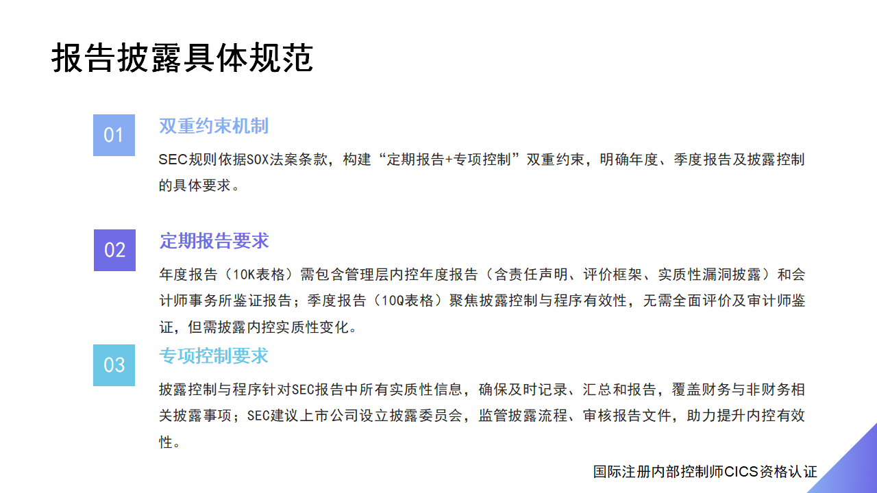 SEC规则围绕SOX法案相关条款,明确了年度、季度报告及披露控制的具体要求,形成了“定期报告 专项控制”的双重约束。一是年度报告(10K表格),需包含管理层内控年度报告、会计师事务所鉴证报告及内控变动披露,其中管理层需声明对内控的责任、明确评价框架,披露内控实质性漏洞,且会计师事务所需对管理层评估出具鉴证报告;二是季度报告(10Q表格),聚焦披露控制与程序的有效性,无需对内控进行全面评价,也无需审计师鉴证,但需披露内控的实质性变化;三是披露控制与程序,专门针对SEC报告中所有实质性信息,确保其及时记录、汇总和报告,覆盖财务与非财务相关披露事项。此外,SEC还建议上市公司设立披露委员会,监管披露流程、审核报告文件,助力内控有效性提升。