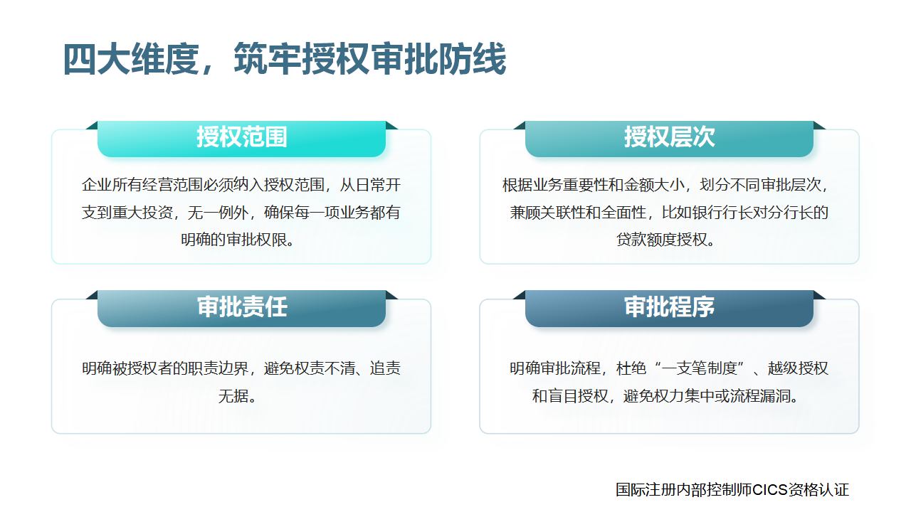 完整的授权审批控制体系,需覆盖授权批准的范围、层次、责任、程序四大核心维度,确保授权合理、审批规范、责任明确,具体内容如下: