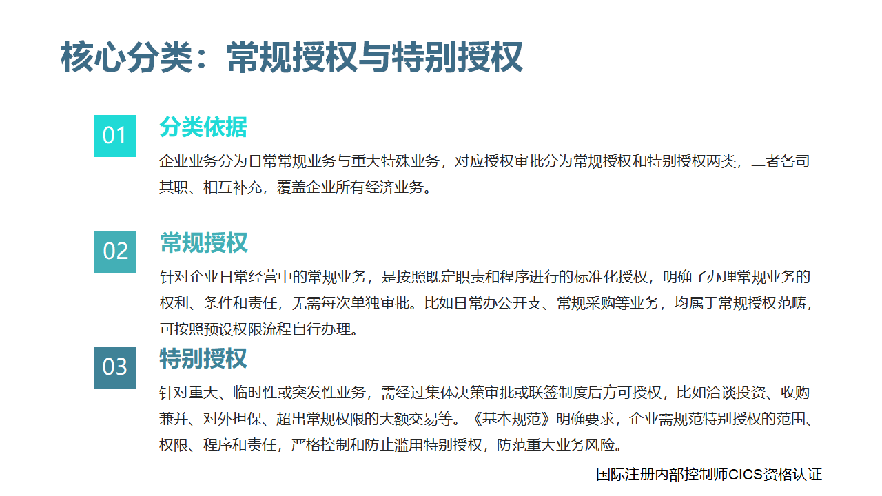 企业的业务分为日常常规业务与重大特殊业务,对应的授权审批也分为常规授权和特别授权两类,二者各司其职、相互补充,覆盖企业所有经济业务。