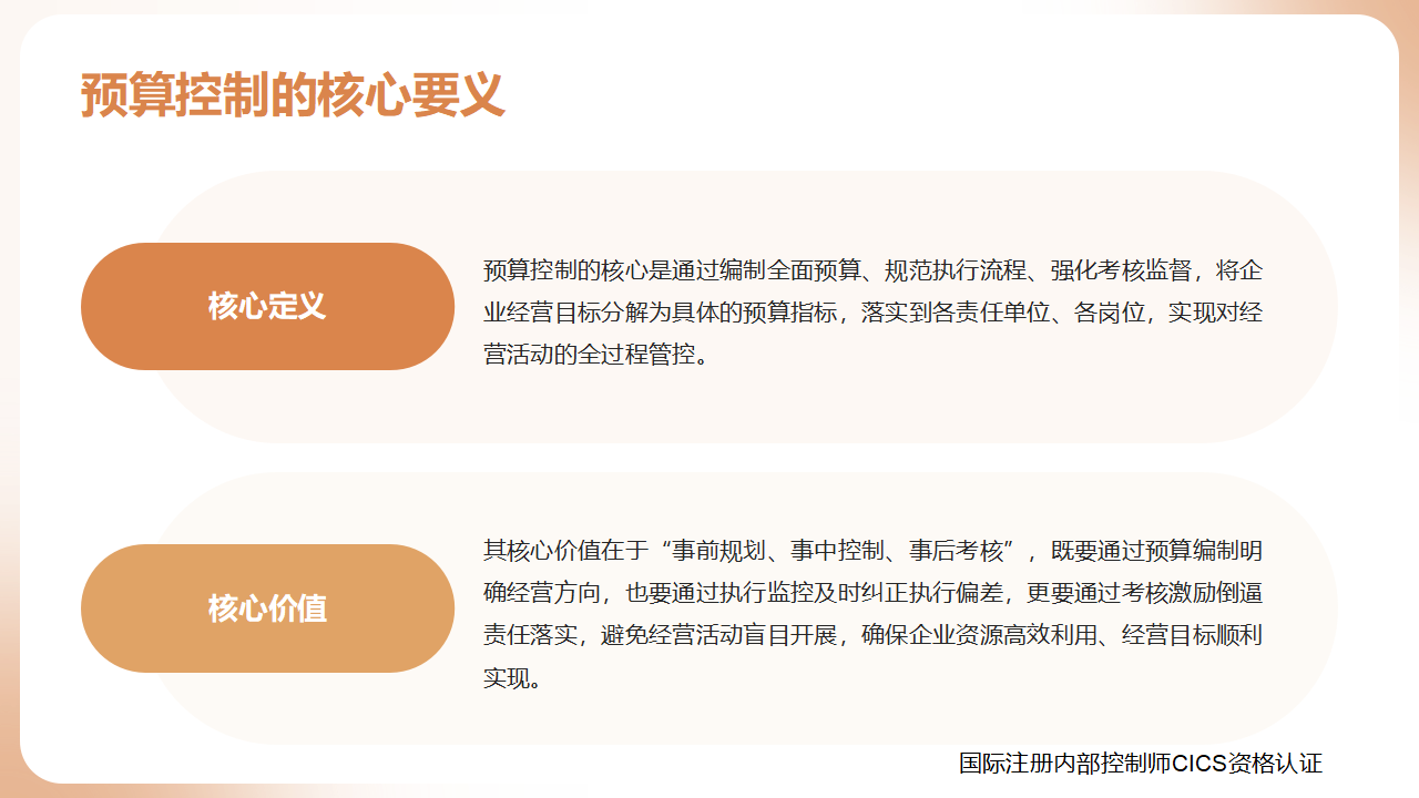 预算控制的核心是通过编制全面预算、规范执行流程、强化考核监督,将企业经营目标分解为具体的预算指标,落实到各责任单位、各岗位,实现对经营活动的全过程管控。其核心价值在于“事前规划、事中控制、事后考核”,既要通过预算编制明确经营方向,也要通过执行监控及时纠正执行偏差,更要通过考核激励倒逼责任落实,避免经营活动盲目开展,确保企业资源高效利用、经营目标顺利实现。