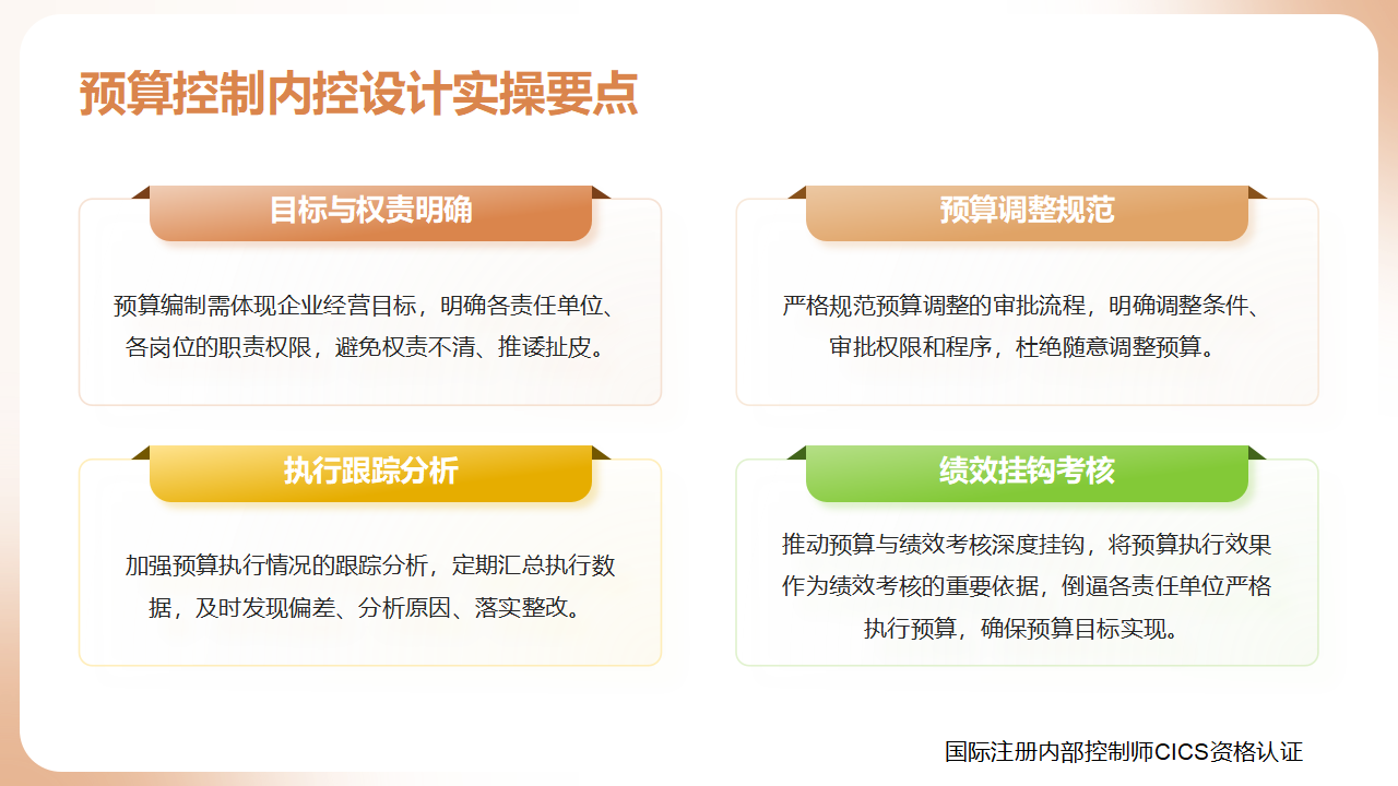 要让预算控制真正发挥作用,避免成为“纸面预算”,企业在设计内部控制时,需重点关注四大核心问题,确保预算管理落地见效:一是预算编制必须体现企业经营目标,明确各责任单位、各岗位的职责权限,避免权责不清、推诿扯皮;二是严格规范预算调整的审批流程,明确调整条件、审批权限和程序,杜绝随意调整预算;三是加强预算执行情况的跟踪分析,定期汇总执行数据,及时发现偏差、分析原因、落实整改;四是推动预算与绩效考核深度挂钩,将预算执行效果作为绩效考核的重要依据,倒逼各责任单位严格执行预算,确保预算目标实现。