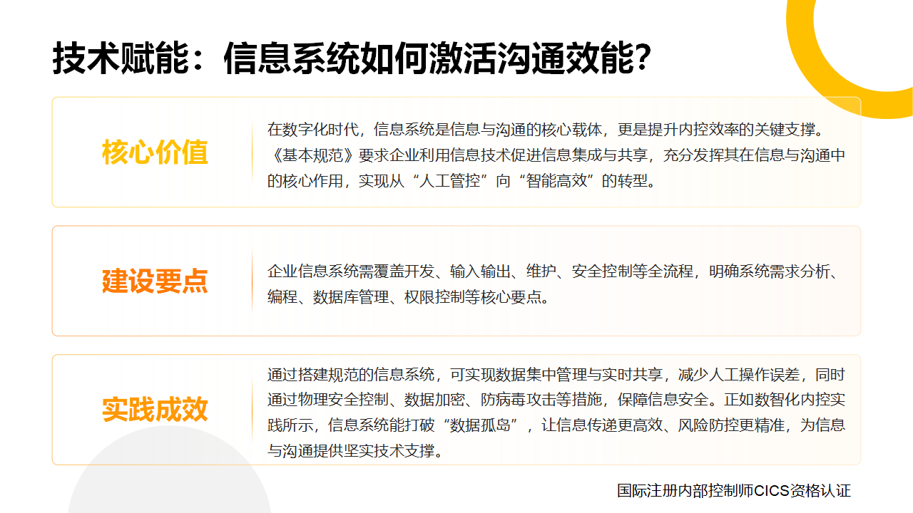 在数字化时代,信息系统是信息与沟通的核心载体,更是提升内控效率的关键支撑。《基本规范》要求企业利用信息技术促进信息集成与共享,充分发挥其在信息与沟通中的核心作用,实现从“人工管控”向“智能高效”的转型。