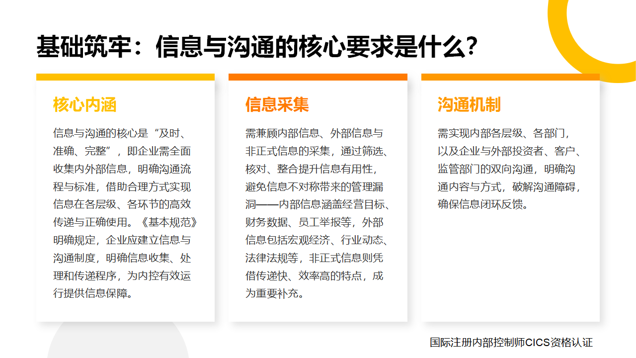 信息与沟通的核心是“及时、准确、完整”,即企业需全面收集内外部信息,明确沟通流程与标准,借助合理方式实现信息在各层级、各环节的高效传递与正确使用。《基本规范》明确规定,企业应建立信息与沟通制度,明确信息收集、处理和传递程序,为内控有效运行提供信息保障。
