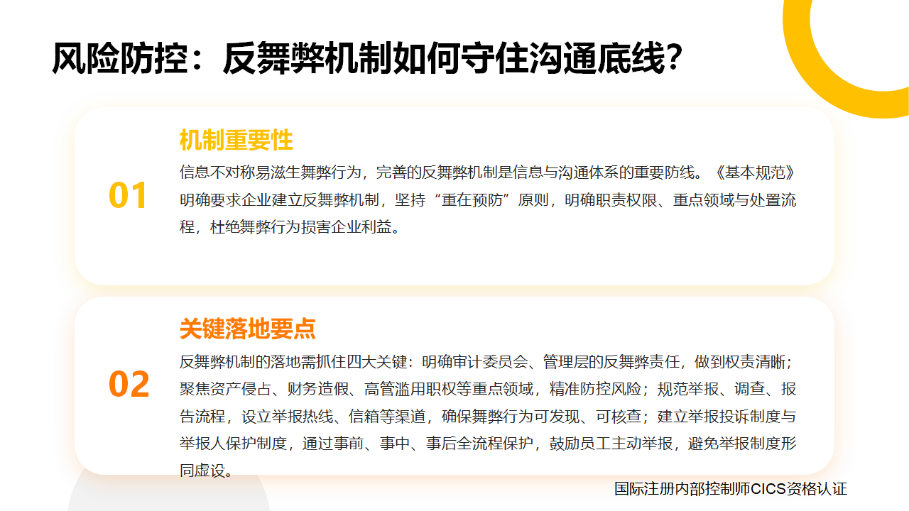 信息不对称易滋生舞弊行为,而完善的反舞弊机制,是信息与沟通体系的重要防线。《基本规范》明确要求企业建立反舞弊机制,坚持“重在预防”原则,明确职责权限、重点领域与处置流程,杜绝舞弊行为损害企业利益。