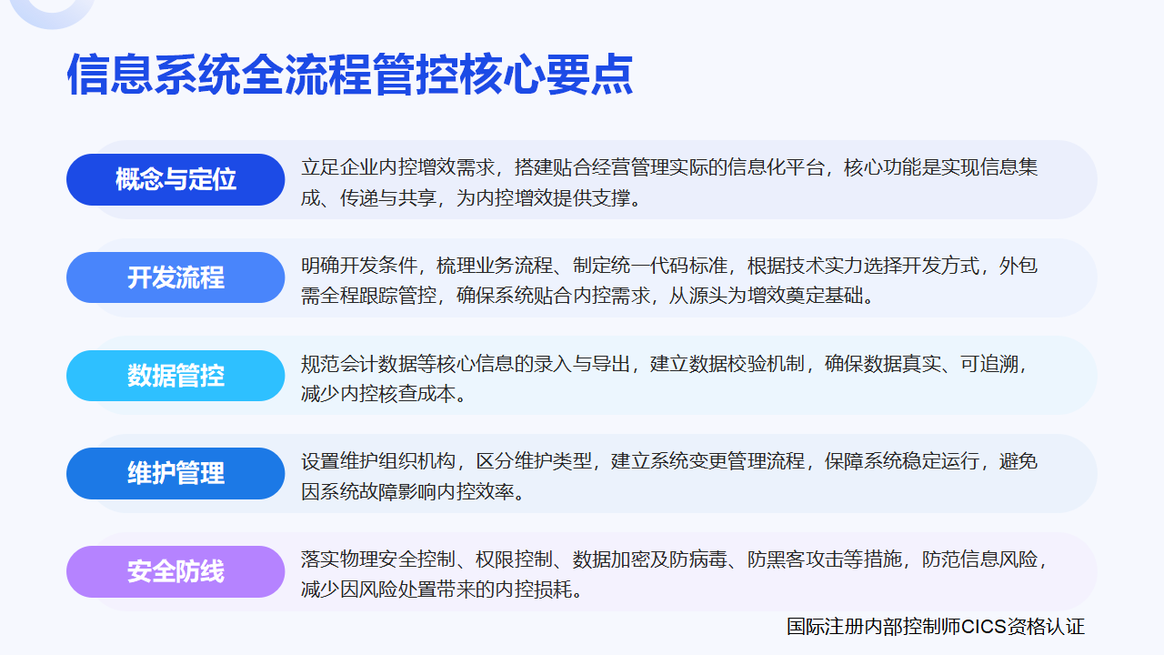 信息系统实现内控增效,不仅需要明确管理要点,更需要落实具体控制措施,结合实操示例,核心控制要点需贯穿系统全流程,确保每一个环节都能精准赋能内控、提升效能。