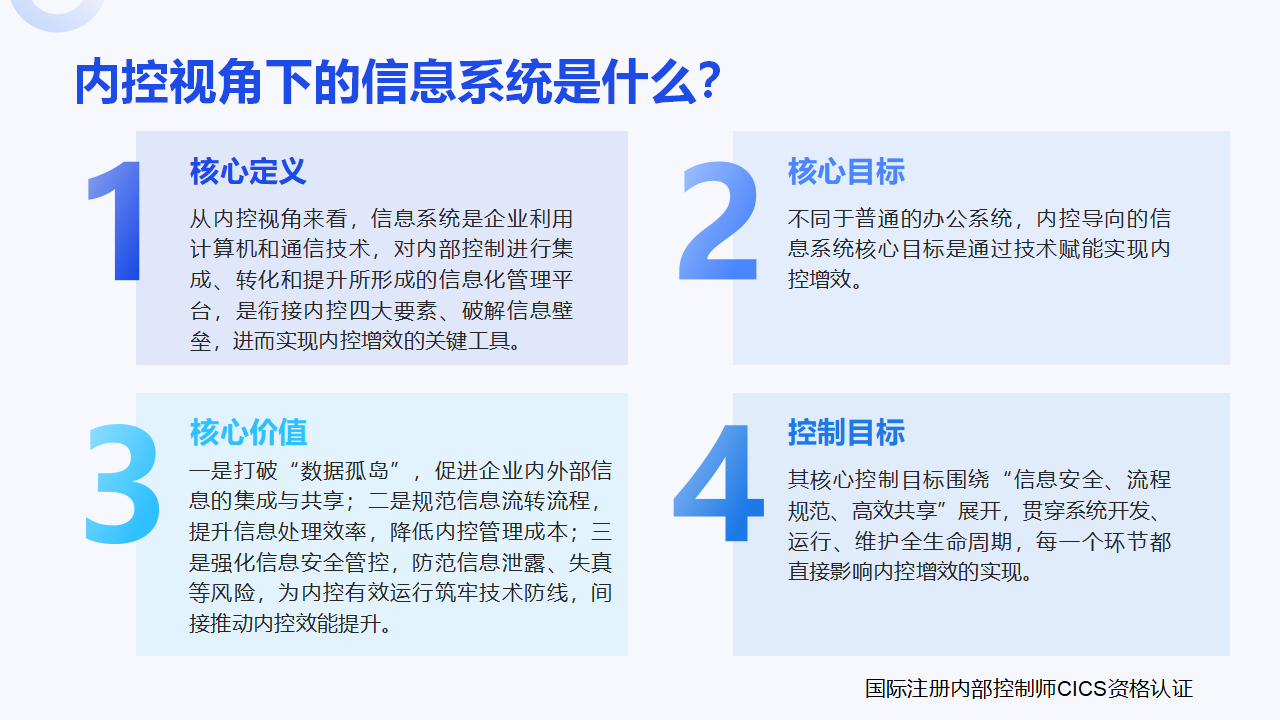 内控实务讲解034:信息系统如何实现内控增效?信息系统是推动企业内控增效的核心技术支撑,作为信息收集、处理、传递、共享的核心载体,信息系统贯穿内控全流...