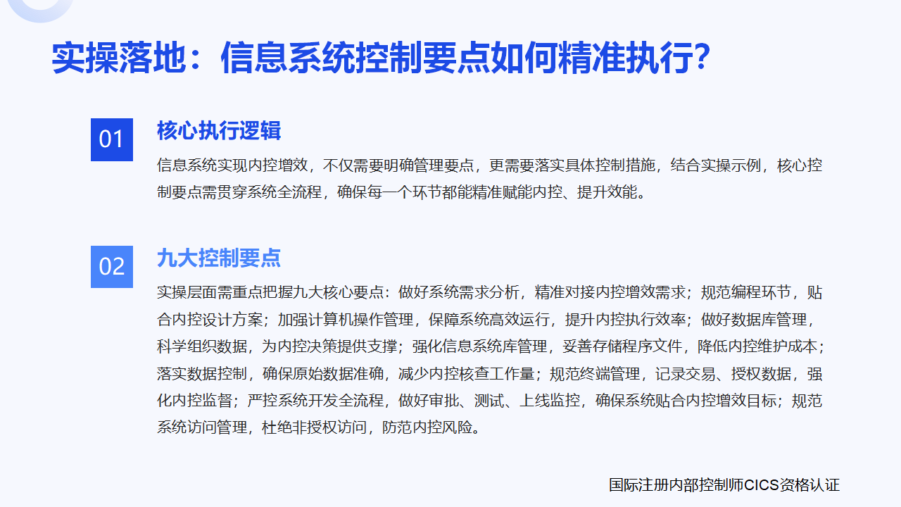 实操层面需重点把握九大核心要点:做好系统需求分析,精准对接内控增效需求;规范编程环节,贴合内控设计方案;加强计算机操作管理,保障系统高效运行,提升内控执行效率;做好数据库管理,科学组织数据,为内控决策提供支撑;强化信息系统库管理,妥善存储程序文件,降低内控维护成本;落实数据控制,确保原始数据准确,减少内控核查工作量;规范终端管理,记录交易、授权数据,强化内控监督;严控系统开发全流程,做好审批、测试、上线监控,确保系统贴合内控增效目标;规范系统访问管理,杜绝非授权访问,防范内控风险。这些要点构成信息系统赋能内控的闭环,为内控增效提供坚实保障。