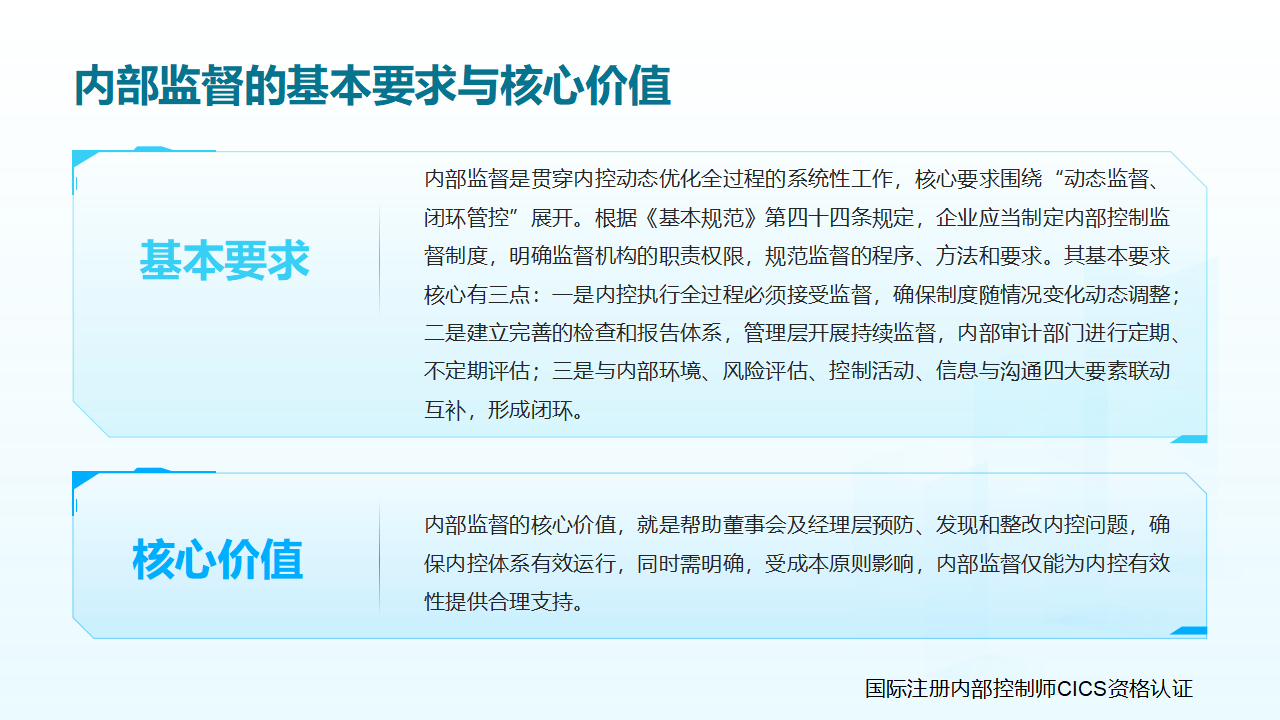 其基本要求核心有三点:一是内控执行全过程必须接受监督,确保制度随情况变化动态调整;二是建立完善的检查和报告体系,管理层开展持续监督,内部审计部门进行定期、不定期评估;三是与内部环境、风险评估、控制活动、信息与沟通四大要素联动互补,形成闭环。内部监督的核心价值,就是帮助董事会及经理层预防、发现和整改内控问题,确保内控体系有效运行,同时需明确,受成本原则影响,内部监督仅能为内控有效性提供合理支持。