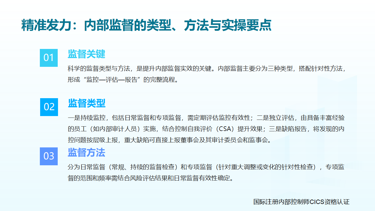 科学的监督类型与方法,是提升内部监督实效的关键。内部监督主要分为三种类型,搭配针对性方法,形成“监控—评估—报告”的完整流程。